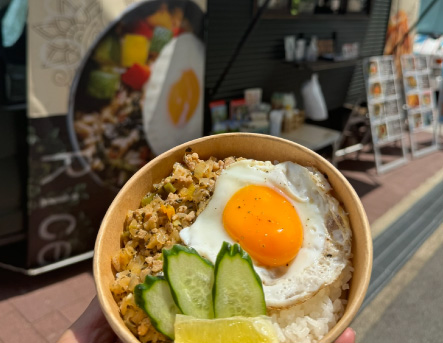 スパイスとハーブに拘ったガパオライス、オリジナルキーマカレーをはじめ、ボリュームたっぷりのロコモコなどのごはん、卵・乳不使用の米粉と豆腐のドーナツ、人気のフレーバーの選べるポテトやドリンク類もご用意しております。